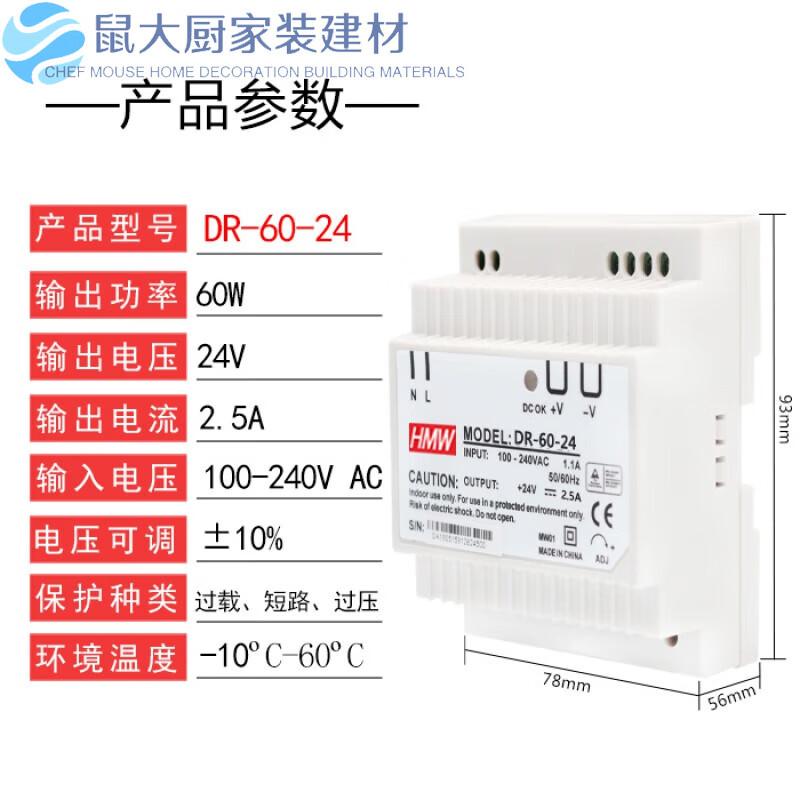 明纬开关电源/15导轨式120W变压器220V转24V5A直流稳压器12V DR-60-24 24V 2.5A