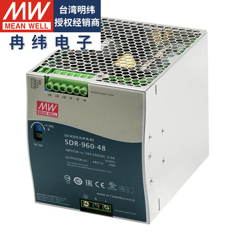明纬(MEANWELL)导轨式开关电源SDR-480W960W直流可调12V24V48V工控10A20A变压器 SDR-960-48