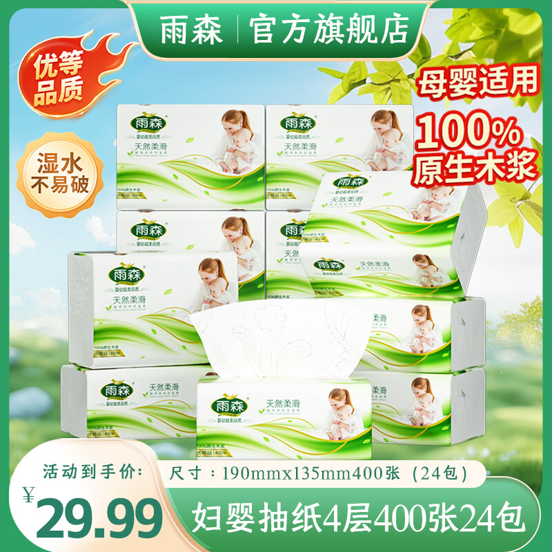 雨森妇婴抽纸母婴适用100%原生木桨家用纸抽4层加厚可湿水纸巾卫生纸 4层 100抽*6包 【热销款】