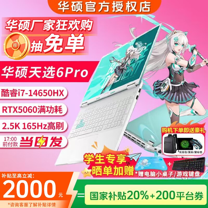 • 华硕天选6 Pro 酷睿版 国家补贴20% 酷睿HX 16英寸电竞游戏本笔记本电脑 酷睿i7-14650HX/RTX5060/魔幻青 16G内存/1T高速固态硬盘 2.5K 16:10高刷高亮高色域电竞屏
