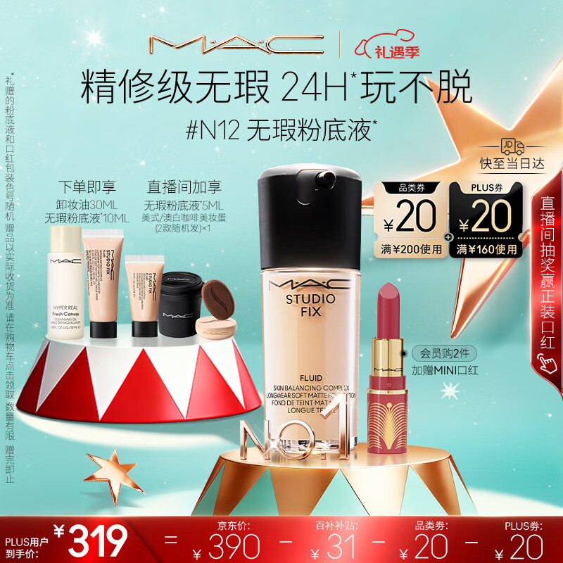 M.A.C【油皮的神】魅可无瑕粉底液控油遮瑕持久不脱妆#N12 圣诞礼物