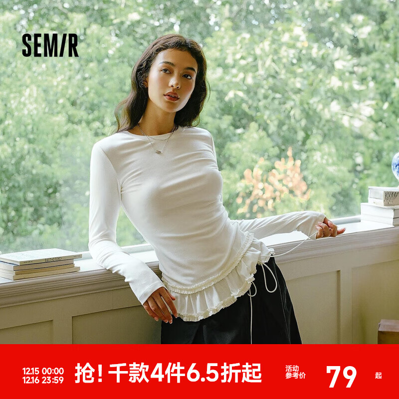 森马(Semir)长袖T恤女纯色木耳边气质紧身冬2025新款荷叶边上衣简约甜美 白色调00311 M