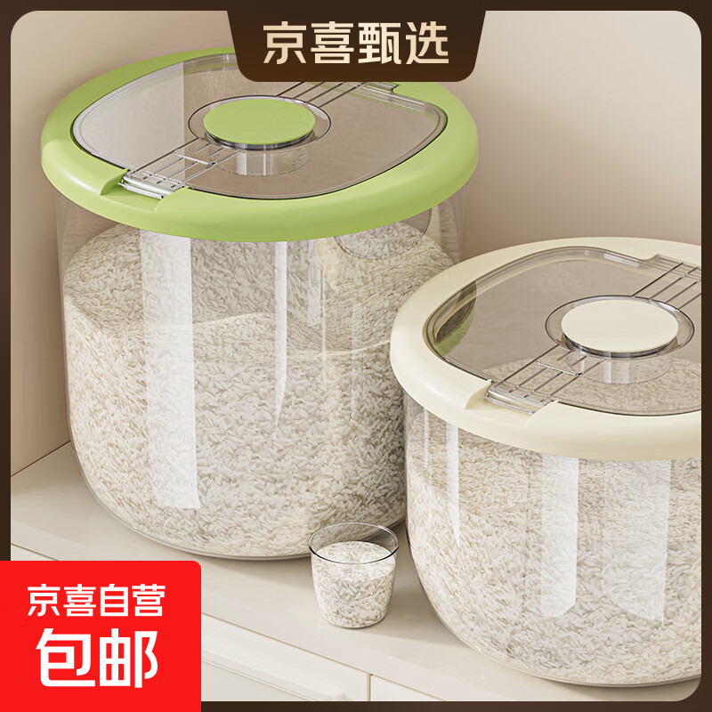 加厚米桶密封储圆形米缸防虫防潮家用翻盖储米箱面粉五谷杂粮收纳 透明-奶油白 10斤装【升级加厚】赠量米杯